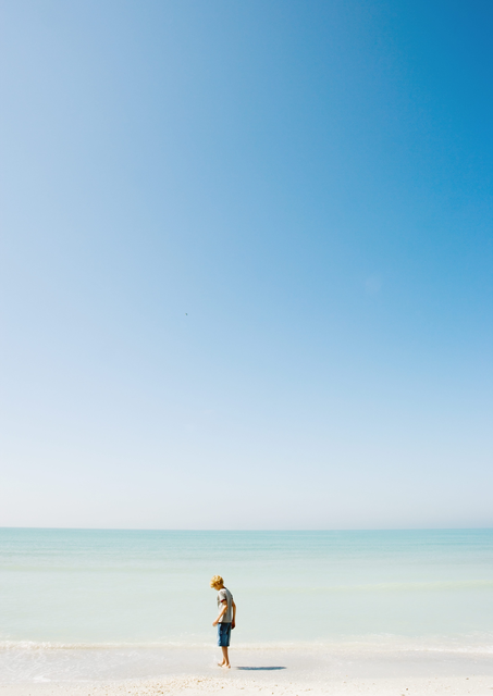 Jeune garçon marchant sur une plage déserte