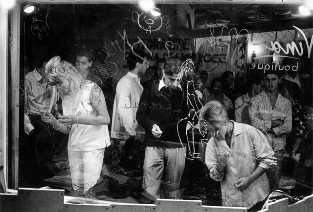 Jeunes dessinant sur une vitrine lors d’un évènement nocturne