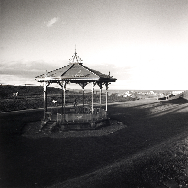 Mots-clés : architecture, barrière, chiens, ciel nuageux, côte, espace vert, Europe, extérieur, gazebo, kiosque, mer, noir et blanc, parc, paysage, pelouse, promenade, rétro, sentier, solitude, vintage