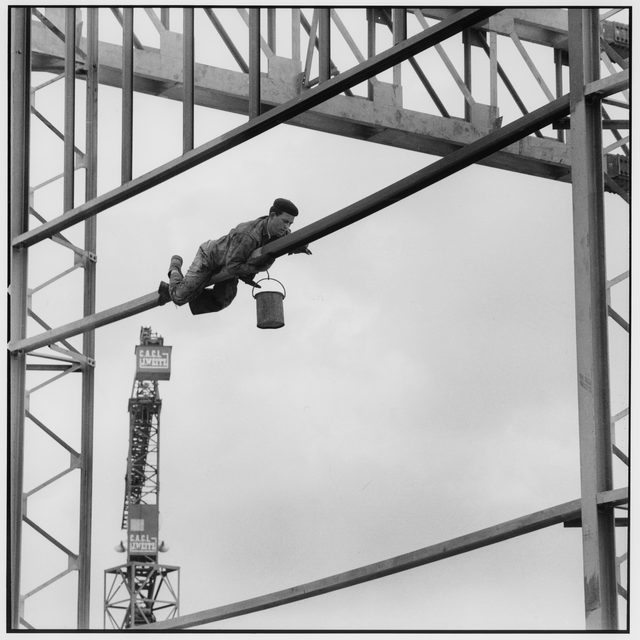Mots-clés : acier, architecture, bâtiment, chantier, construction, échafaudage, équipement, extérieur, hauteur, homme, industrie, métal, noir et blanc, ouvrier, seau, sécurité, structure, travail, travailleur, urbain