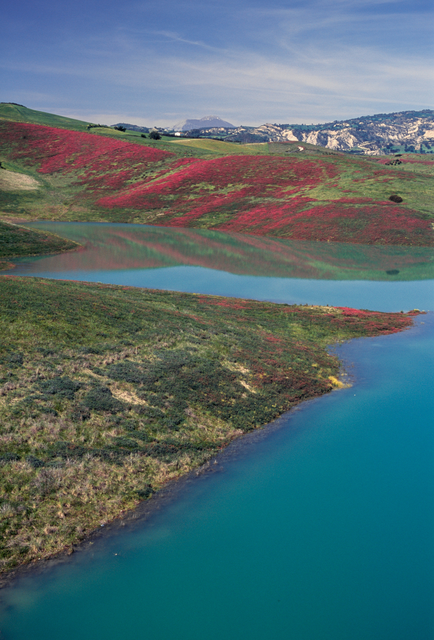 Paysage désertique avec cercles de sel et montagnes en arrière-plan