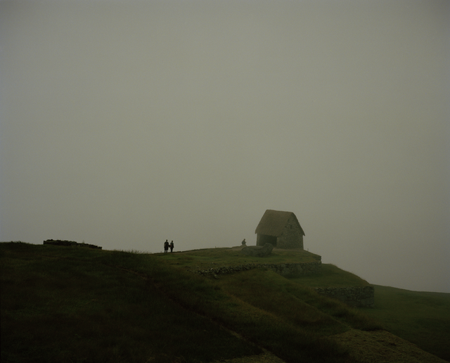 Maison rouge au bord d’un lac avec montagnes enneigées en arrière-plan
