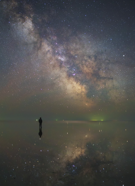 Personne observant la Voie lactée réfléchie sur l’eau