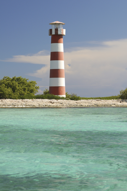 Phare à rayures rouges et blanches sur une île tropicale.