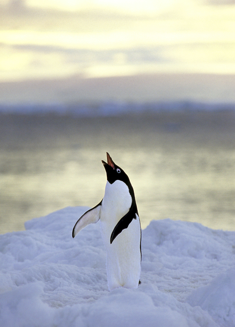 Pingouin Adélie dans la neige criant face à la mer