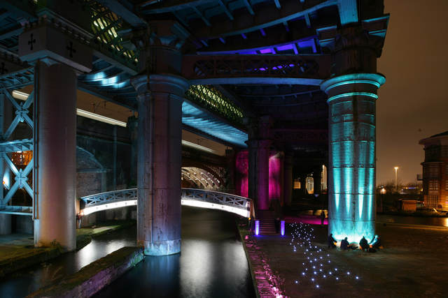 Pont illuminé au-dessus d’un canal nocturne