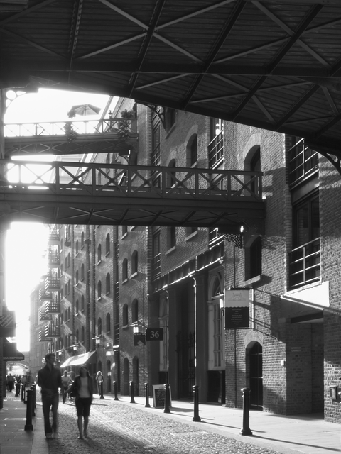 Promenade dans une rue historique en noir et blanc