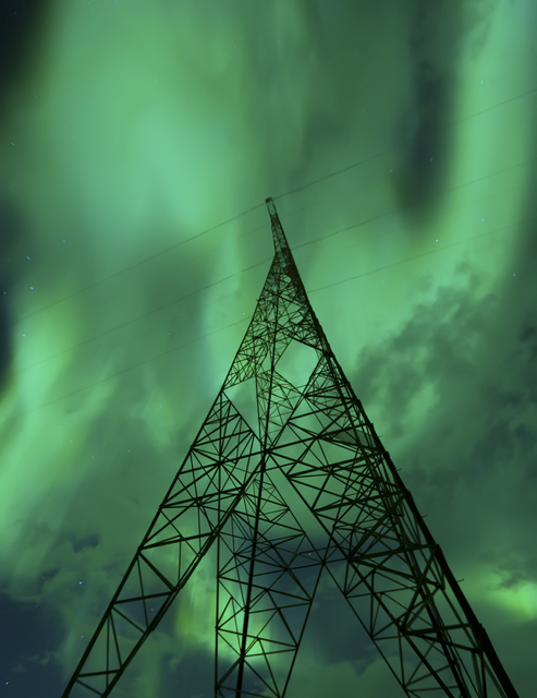 Mots-clés : aurores boréales, ciel, ciel étoilé, ciel nocturne, électricité, énergie, environnement, extérieur, infrastructure, lumière naturelle, nature, nord, nuit, paysage, phénomène naturel, polarité, pylône, structure métallique, vert