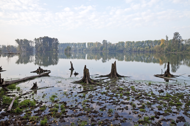 Reflet d’une forêt sur un lac avec souches d’arbres