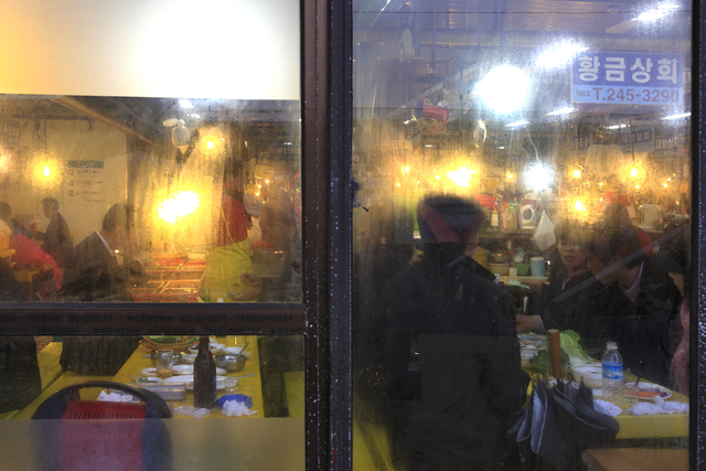 Scène de rue à travers la vitrine d’un restaurant asiatique.