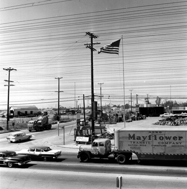 Scène de rue avec camion et drapeau américain
