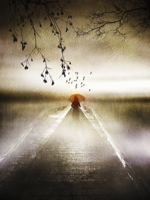 Silhouette avec parapluie orange sur un pont brumeux