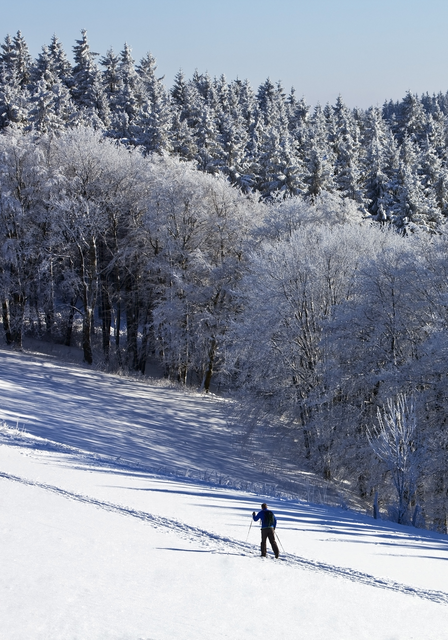 Skieur solitaire dans une forêt enneigée