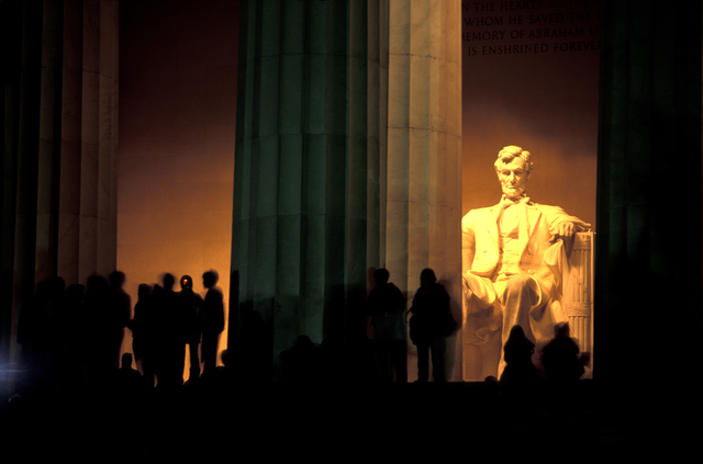 Statue d’Abraham Lincoln au Mémorial avec visiteurs nocturnes