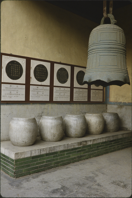 Cloches anciennes et pots en pierre dans un temple asiatique