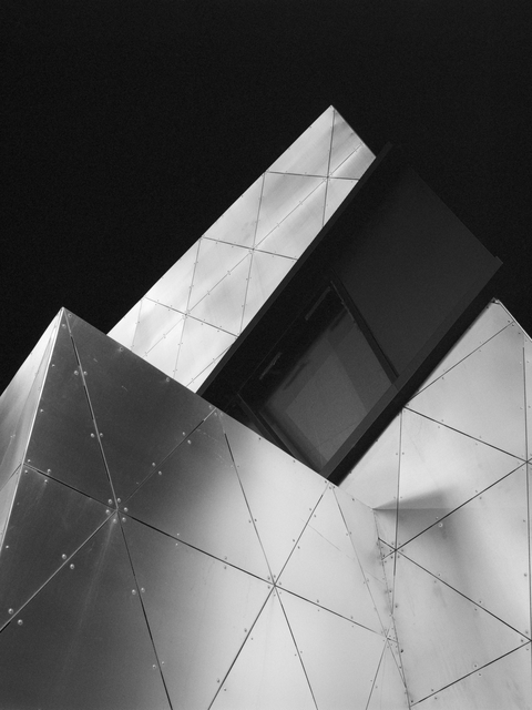 Mots-clés : abstrait, angle, architecture, art, bâtiment, construction, contemporain, design, extérieur, façade, géométrie, innovation, lignes, métallique, minimalisme, moderne, noir et blanc, structure, texture, urbanisme