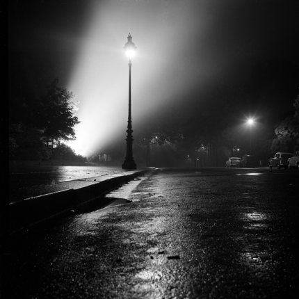Lampadaire éclairant une rue vide par une nuit brumeuse