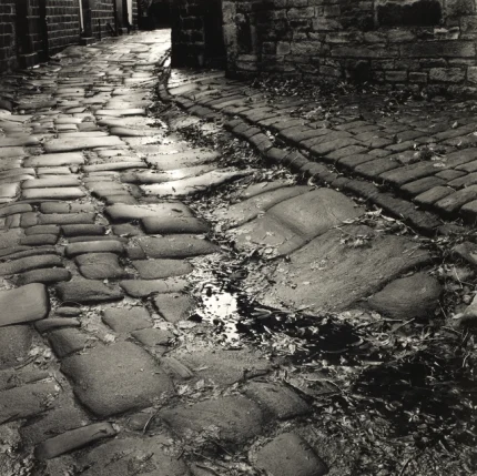 Ruelle nocturne avec enseigne d’hôtel illuminée