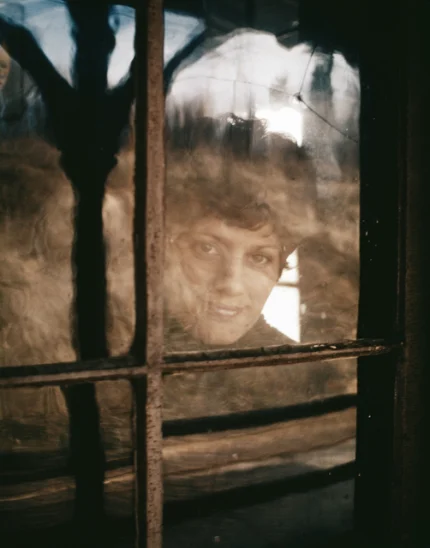 Femme regardant à travers une fenêtre ancienne avec une vue brouillée