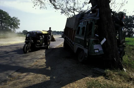 Accident de camion contre un arbre et tuk-tuk sur une route rurale