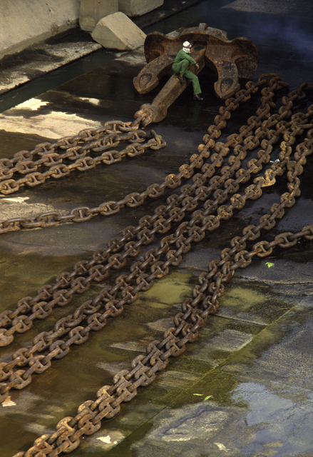 Mots-clés : acier, ancre, bateau, chaîne, dock, entretien, équipement, industriel, infrastructure, lourd, marin, métal, port, quai, rouille, sécurité, travail, travailleur, usine, vaste