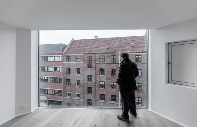 Un homme regarde par la fenêtre vers des bâtiments en briques