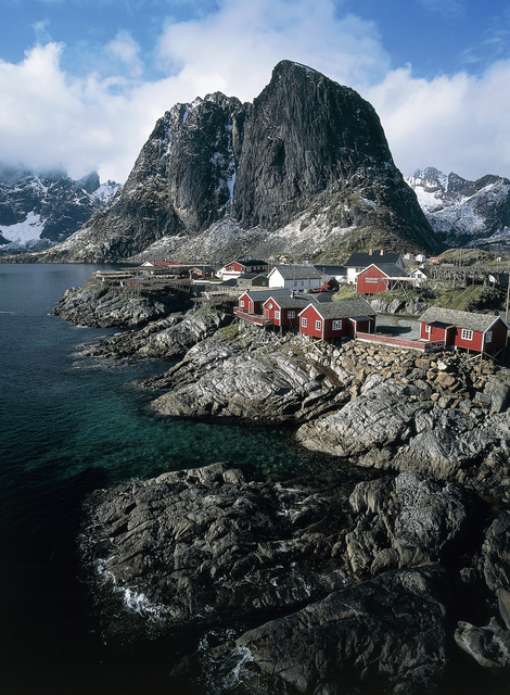 Village de pêche pittoresque près de montagnes imposantes