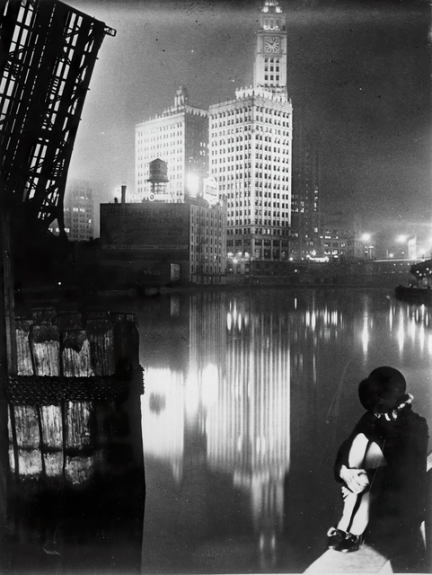 Vue nocturne d’une ville avec une femme pensant près de l’eau