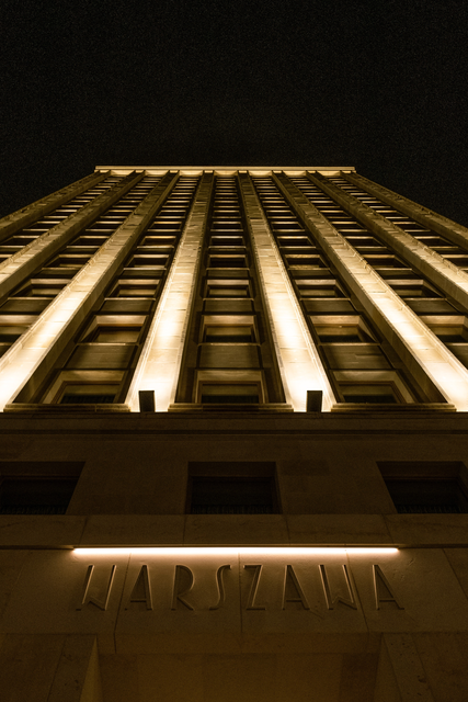 Immeuble éclairé de nuit à Varsovie