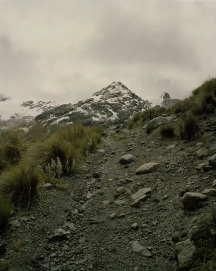 Sentier rocheux menant à une montagne enneigée