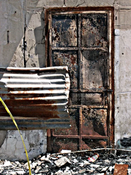 Vieille façade de bâtiment délabré avec porte et fenêtres abîmées