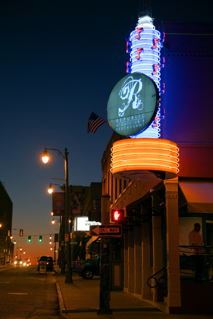 Panneaux lumineux de rue devant un club nocturne au crépuscule