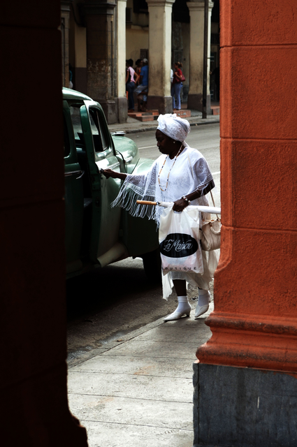 Femme en blanc ouvrant la porte d’une voiture verte dans une rue urbaine.