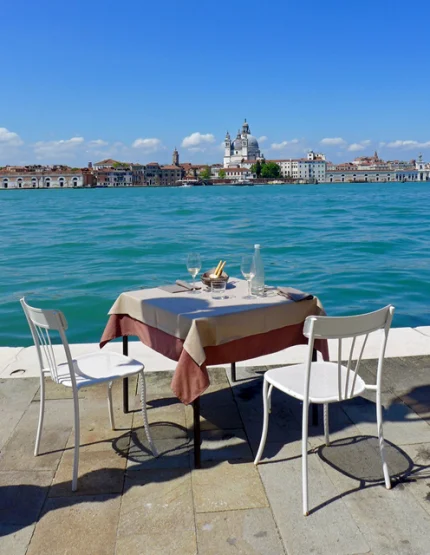 Table de café au bord de l’eau avec vue sur une ville européenne