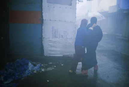 Deux femmes sous un parapluie transparent marchant dans une rue brumeuse