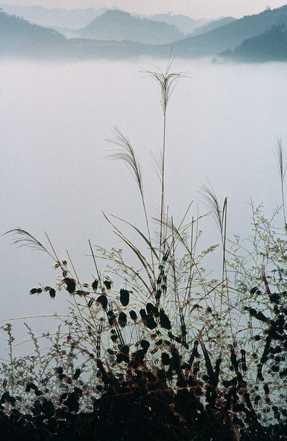 Collines embrumées avec plantes au premier plan