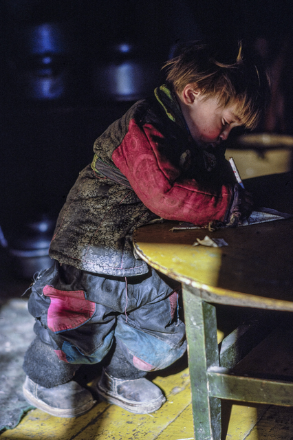 Enfant écrivant à une table en intérieur sombre