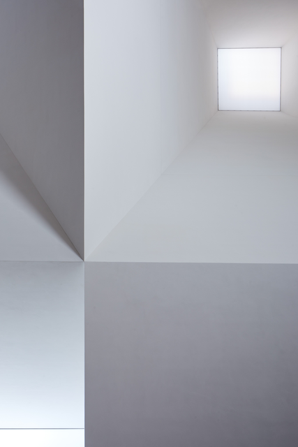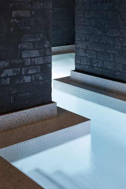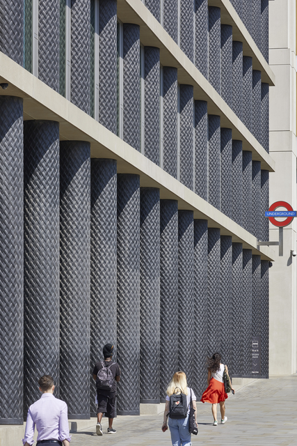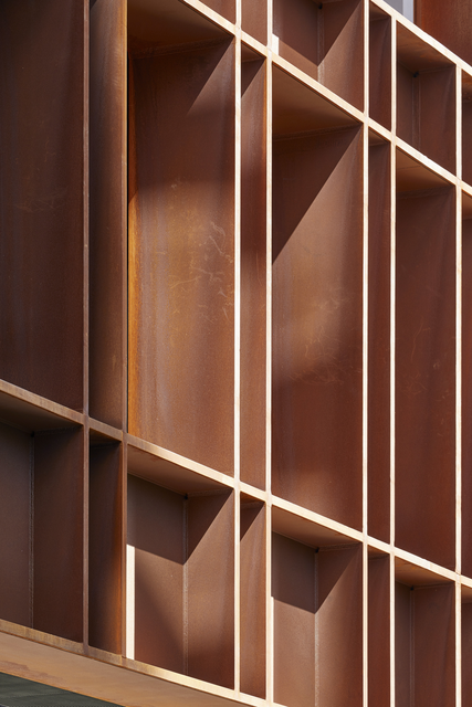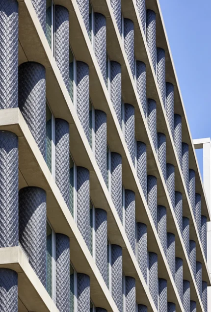 Bâtiment en béton avec arcades et une personne sur le balcon