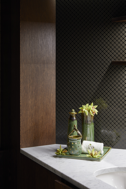 Évier blanc avec robinet orange sur un mur carrelé gris