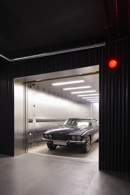 Voiture ancienne dans un ascenseur de stationnement moderne