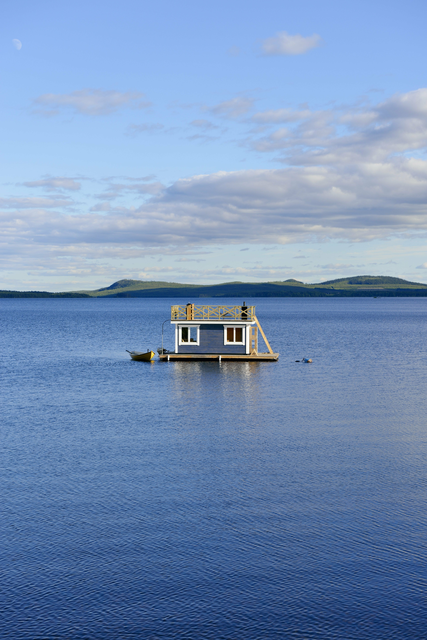 Maison flottante sur un lac paisible avec collines en arrière-plan